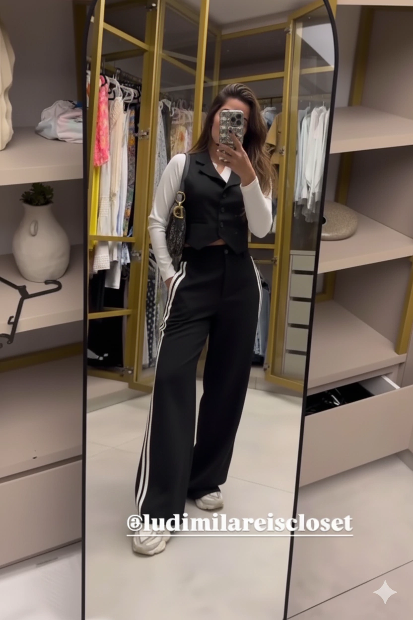 A CALÇA LISTRA LATERAL + COLETE (PRETO) COM LAPELA é a escolha ideal para quem busca elegância e conforto em uma única peça. Confeccionada com tecido de alta qualidade, proporciona um caimento perfeito que valoriza todos os tipos de corpo. Seu tom azul traz sofisticação e modernidade, perfeita para ambientes profissionais ou ocasiões especiais. Com acabamento refinado e costura reforçada, esta calça une durabilidade e estilo.